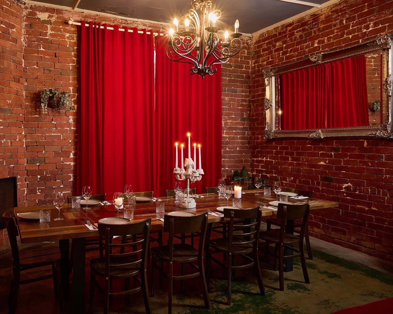 Our small semi-private dining room is enclosed by plush velvet curtains with a private fireplace to create an intimate environment. This room is located within the heart of the venue and perfect for corporate meetings or groups looking for a relaxed atmosphere.